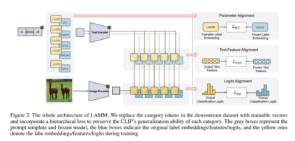 随着CLIP等预训练视觉-语言(VL)模型在视觉表示任务中的成功,将预训练模型迁移到下游任务已成为一个关键范式。最近,源自自然语言处理(NLP)的提示调整范式在VL领域取得了显著进展。然而,早期方法主要集中于为文本和视觉输入构建提示模板,忽略了VL模型与下游任务之间类别标签表示的差距。为了应对这一挑战,我们引入了一种名为LAMM的创新标签对齐方法,可以通过端到端训练动态调整下游数据集的类别嵌入。此外,为了实现更合适的标签分布,我们提出了一个分层损失,包括参数空间、特征空间和逻辑空间的对齐。我们在11个下游视觉数据集上进行了实验,并证明了我们的方法显著提高了现有多模态提示学习模型在小样本场景中的性能,与最先进方法相比,在16次射击上平均准确率提高了2.31(%)。此外,我们的方法在持续学习方面与其他提示调整方法相比显示出了优势。重要的是,我们的方法与现有的提示调整方法是协同的,并可以在它们的基础上提高性能。我们的代码和数据集将在https://github.com/gaojingsheng/LAMM上公开。