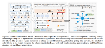在我们的研究中,我们提出了一个基于知识图谱(KGs)的自适应多方面检索增强(AMAR)框架。该方法检索包括实体、关系和子图的知识,并将每一条检索到的文本转换为提示嵌入。AMAR框架包含两个关键子组件:1)自对齐模块,旨在对齐实体、关系和子图之间的共性,以增强检索文本,从而减少噪音干扰;2)相关性门控模块,采用软门控机制学习问题与多方面检索数据之间的相关性评分,以确定哪些信息应该被用来增强LLM的输出,甚至是完全过滤掉。