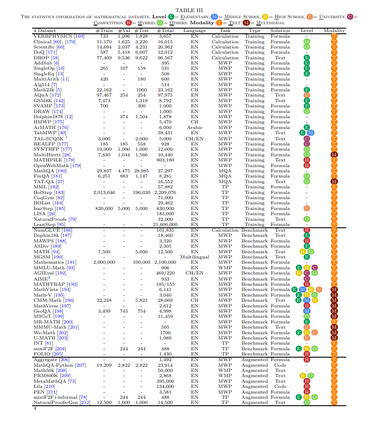 近年来,预训练语言模型(PLMs)与大语言模型(LLMs)的崛起推动了该领域的突破性进展[15][16]。诸如BERT[17]、RoBERTa[18]、BART[19]、GPT-1[20]和GPT-2[21]等模型,通过从大规模文本语料中学习,展现出卓越的语言与数值推理能力。为增强PLMs的数学推理性能,研究者探索了多种技术,包括针对数学数据集的预训练与微调[22]–[24]。GenBERT[23]、NF-NSM[24]、MathBERT[25]和LISA[26]等模型将数值数据与数学表达式融入训练目标,提升了符号与数值推理能力。此外,专用损失函数和任务模块等架构创新进一步优化了PLMs的数学理解[27]–[30]。