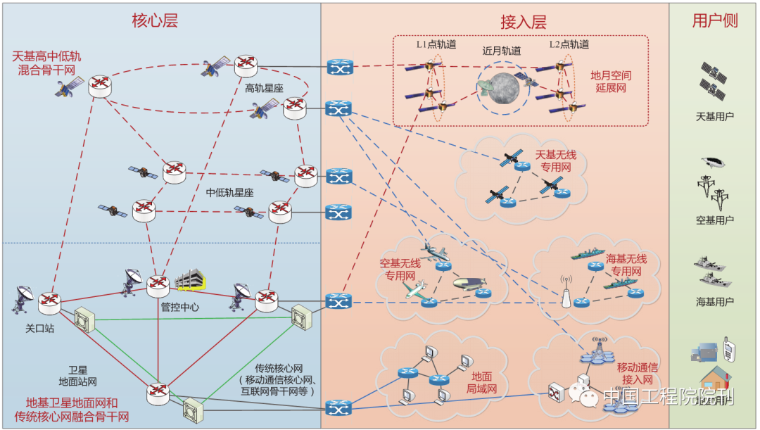 陆海空天一体化信息网络的天地双骨干架构、地月空间延展网等各类接入层网络,主要面向政府、军队、企业等领域开展应用,按照“网络拓展、服务延伸”思路,将传输组网、应用服务、安全防护、运维管控等功能向用户端延伸并与用户应用集成,形成满足地面、海基、空基、天基等不同用户需求的应用系统。
