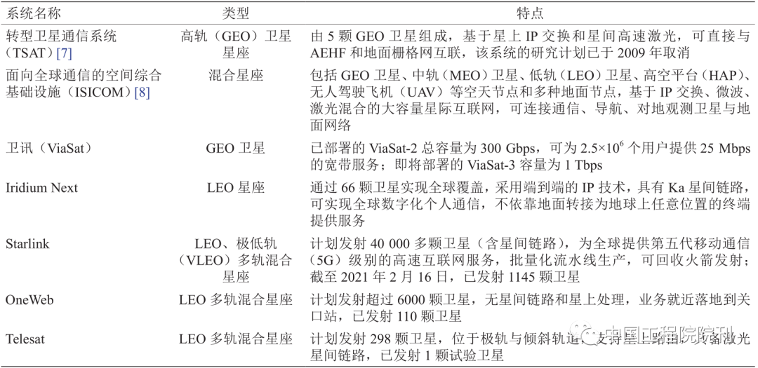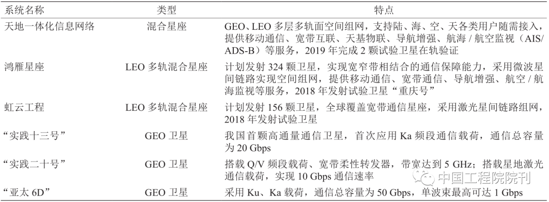 我国正处于推进天基信息网、未来互联网、移动通信网全面融合发展的初级阶段。2016年,天地一体化信息网络重大项目列入国家“十三五”规划纲要和《“十三五”国家科技创新规划》;2020年,卫星互联网确定为“新型基础设施建设”的信息基础设施之一。科研院所和相关企业大力发展低轨小卫星星座,如鸿雁星座、虹云工程等,相关试验卫星已完成在轨关键技术验证。在积极发展天基网络的同时,我国继续发展新一代高通量通信卫星,先后发射了“实践十三号”“亚太6D”以及新技术体制试验卫星“实践二十号”;高通量通信卫星对地覆盖范围越来越完善,通信容量越来越大,逐步成为我国地面网络基础设施的重要拓展形式。相关天基信息系统的基本情况如表2所示。