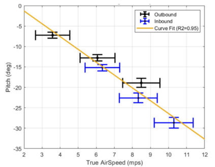 本研究的COTS平台是一种VTOL飞行器,可在10分钟内由一个两人小组轻松部署,是当前技术的代表[7]。该COTS平台的设计飞行特性包括最大横向速度为15.6米/秒,最大辅助速度为3米/秒,最大倾斜角度为32度[7]。Yang为Aqua-Quad提供的稀少数据表明攻角和真实空速之间存在线性关系[8]。图2显示了Aqua-Quad的数据。