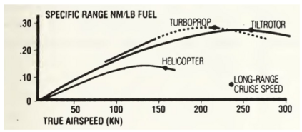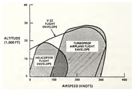 "飞机的航程取决于诸如空速、燃料容量、载荷、悬停要求和起飞/降落配置等因素" [13]。传统的飞机在起飞时的推力值是被提升的总重量的百分之三十到四十[11]。对于VTOL飞机,垂直升降模式下的推重比必须超过工作重量一定的幅度[14]。图4显示了V-22飞行包络线与传统飞机相比的优势。