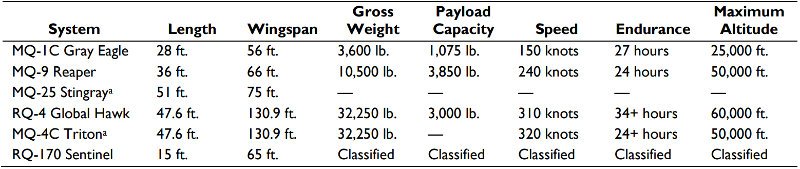 除了RQ-170 "哨兵 "是一个公认的机密无人机系统项目外,这些选定的系统都有国防部发布的选定采购报告,其中提供了详细的信息和系统特征。表2提供了这些选定的无人机系统的特征摘要。