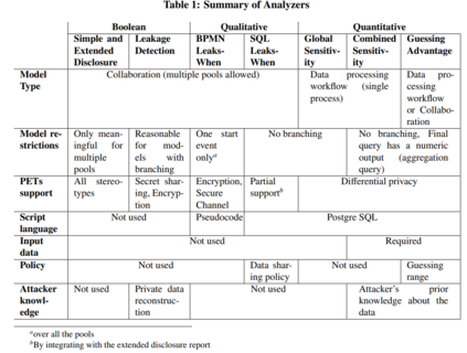 本文提出了大量用于描述业务流程隐私属性的建模和分析工具。建模注释和分析以业务流程建模符号(BPMN)为基础,分为三大抽象层级。第一个层次允许查看哪些输入数据源直接或间接地披露给流程中的每一方。第二层显示了每次披露发生的条件,以及披露的具体属性。第三层可以衡量披露在多大程度上揭示了单个项目的信息。大多数分析都集成到 Pleak 工具中,从而提供了一个统一的界面。