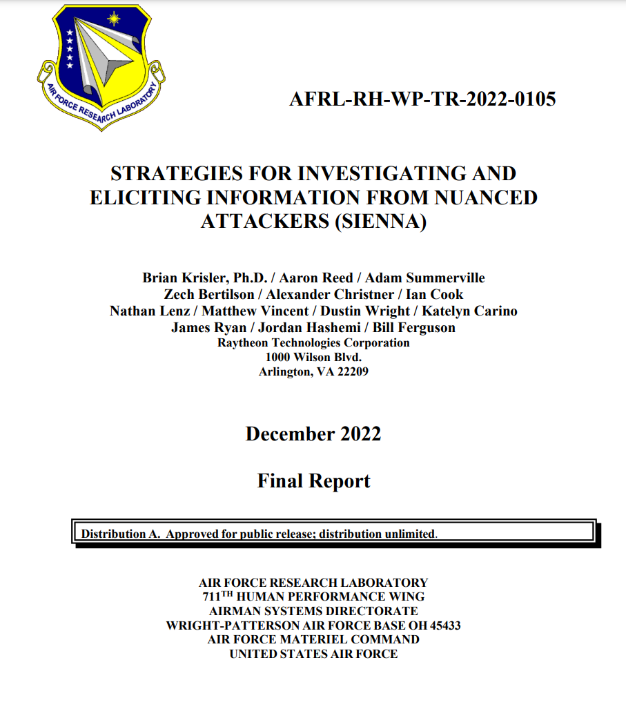 本报告详细介绍了一种使用聊天机器人技术与对话者接触的新方法,同时通过使用软件代理中实现的独特虚拟角色积极征求信息。这项研究名为 "调查和获取攻击者信息的策略"(SIENNA),是在国防高级研究计划管理局(DARPA)主动社会工程防御(ASED)项目的技术领域(TA)2下进行的。