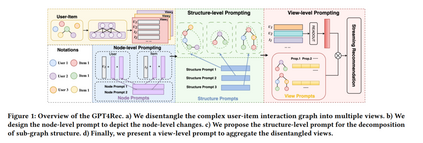 为了解决这些困难,我们提出了GPT4Rec,一种用于流式推荐的图提示微调方法。在不断演变的用户-物品交互图中,GPT4Rec首先将图模式解缠到多个视图中。在不同视图中隔离特定的交互模式和关系后,GPT4Rec利用轻量级图提示有效引导模型在用户-物品图中的不同交互模式中进行适应。首先,节点级提示用于指导模型适应图中各个节点属性或特性的变化。其次,结构级提示引导模型适应图中更广泛的连接和关系模式。最后,视图级提示创新性地设计用于促进从多个解缠视图中聚合信息。这些提示设计使GPT4Rec能够综合理解图结构,确保考虑并有效整合用户-物品交互的所有重要方面。