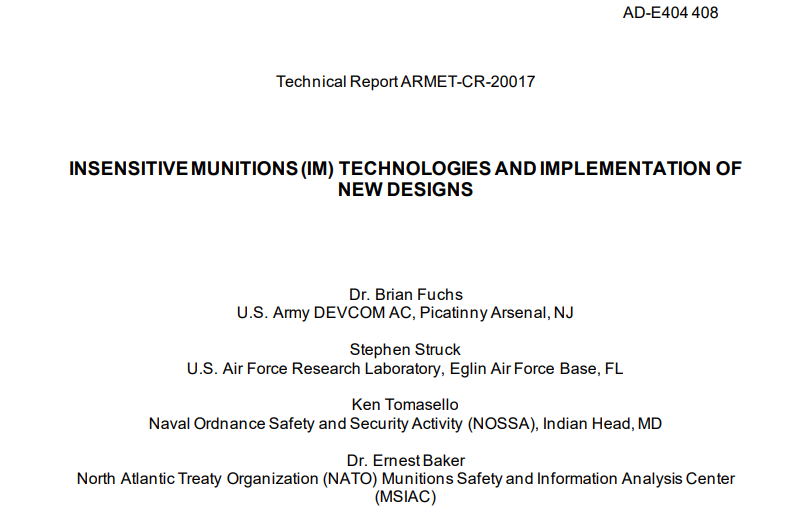 "爆炸性弹药设计方面的技术进步使得开发一系列被称为不敏感弹药(IM)或风险弹药(MURAT)的弹药成为可能,这些弹药在受到意外和商业刺激时比以前的武器危险性更低。这类弹药在其预期的应用中仍然有效,而且对极端但可信的环境,如热、冲击或撞击的敏感度低于其前身。