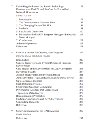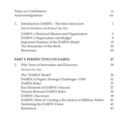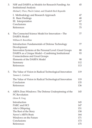 第一部分,“对DARPA的观点”,共有七章。第2章由Richard Van Atta编写,讲述了DARPA的前五十年历史。第3章,由Michael Piore、Phech Colatat和Elisabeth Beck Reynolds共同撰写,比较了DARPA的文化与更传统的联邦研发机构,包括NSF。第4章,由William B. Bonvillian编写,探讨了“DARPA模型”,特别是它如何遵循二战期间开发的方法,将前沿科学与解决具体技术挑战相结合。第5章,由Tamara Carleton编写,讨论了技术愿景在DARPA的运作和成果中的核心角色。第6章,由Glenn R. Fong编写,是关于DARPA资助的发明在个人计算机及其软件发展中的中心作用的历史。第7章,由Erica R. H. Fuchs编写,探讨了DARPA的治理方法作为一个内嵌网络。第8章,由David W. Cheney和Richard Van Atta共同撰写,探讨了DARPA创建新项目的过程,并研究了几个过去DARPA项目的起源。第9章,由Patrick Windham编写,探讨了一系列关于DARPA模型的问题。 第二部分,“DARPA项目经理的角色”,包括第10章和第11章,由两位前DARPA项目经理Jinendra Ranka和Larry Jackel编写。 第三部分,“在其他情境中应用DARPA模型”,包含两章。第12章,由William B. Bonvillian编写,探讨了DARPA创新模型为国防部其他较旧的“遗产部门”提供的教训。第13章,由William B. Bonvillian和Richard Van Atta共同撰写,探讨了领导者如何有效地将DARPA模型应用于(当时)相对较新的高级研究项目局-能源(ARPA-E),以及来自ARPA-E本身的组织教训。第14章,由William B. Bonvillian编写,讨论了IARPA,另一个DARPA克隆机构。第15章,由Robert Cook-Deegan编写,探讨了将DARPA模型应用于国家卫生研究院(NIH)的可能性。第四部分,“结论”,由Richard Van Atta、Patrick Windham和William B. Bonvillian共同编写的第16章组成,总结了从DARPA的经验中如何构建一个成功创造新颖、创新技术的组织的关键教训。 这些各个章节在某种程度上有所重叠。然而,本书的编辑希望它们共同为读者提供了关于这个卓越的政府机构是如何运作的,以及为什么它能够取得如此出色的成功的全面见解。