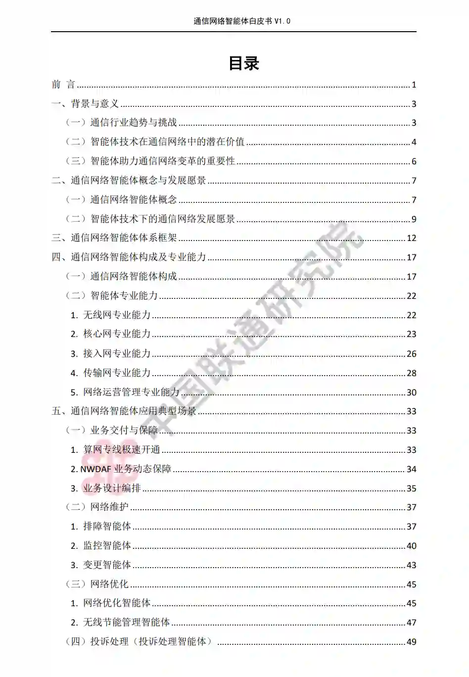在全球信息通信业高速发展的浪潮下,5G-A、6G 技术引领ICT基础设施迭代升级,AI 智能体加速产业数智转型,通信行业迎来机遇的同时,也面临网络规模扩张、用户需求多元、技术快速迭代带来的挑战,如网络资源利用率低、运维成本高、服务质量保障难等问题。AI 智能体具备自主记忆、推理、规划和执行等能力,智能体技术与通信网络的融合为通信行业带来变革可能:在网络层面,可推动网络架构向动态自治演进,实现资源智能分配与协同优化;网络运营管理上,可重塑运维模式,实现全流程自动化与主动运维;终端侧,可打造协同感知的智能边缘生态。 为此,中国联通研究院联合合作伙伴共同撰写了本白皮书,提出了通信网络智能体的概念与发展愿景、体系框架、体系构成及关键能力、典型场景、演进路径等,助力通信行业打造智能体驱动的“AI原生网络”,推动通信网络成为无缝融入生活的智能基础环境,最终实现“网络随人而动、体验因需而生”的终极愿景。全球信息通信业蓬勃发展。5G-A、6G 引领ICT 基础设施升级,骨干网络跨入 400G 时代,无处不在的“四个万兆”超宽带接入为全社会提供高品质联接。AI 智能体加速产业数智转型,诸多运营商研发网络大模型,期望用 AI 智能体提升用户体验、加速业务创新、变革运营模式、重塑集成模式,推动经济社会进入全新智能时代,帮助运营商和企业提升效率并创造价值。全新智能时代,“网络化、数字化、自动化、智能化、跨界融合、安全 & 隐私”等特点将更加凸显,更多的生产经营场景将由系统或智能体自动化执行,计算感知融合、通感一体将实现多模交互的超现实体验,安全&隐私也将变得更加关键和普遍。当前通信行业在网络规模扩张、用户需求多元化、技术迭代加速背景下,面临网络资源利用率低、运维成本攀升、服务质量难以精准保障等困境。这些都将对信息通信业带来全新挑战。电信运营商需要全面贯彻新发展理念,坚持构建领先的数字信息基础设施,着力提高网络硬实力,并积极探索AI 智能体技术在网络领域的落地执行,持续提升网络的智能化、服务化、协同化水平,提高服务和赋能行业数转能力,在更高起点、更深连通、更优体验上支撑和服务高质量发展,推进高标准网络运营、高水平网络创新、高效能降本增效。