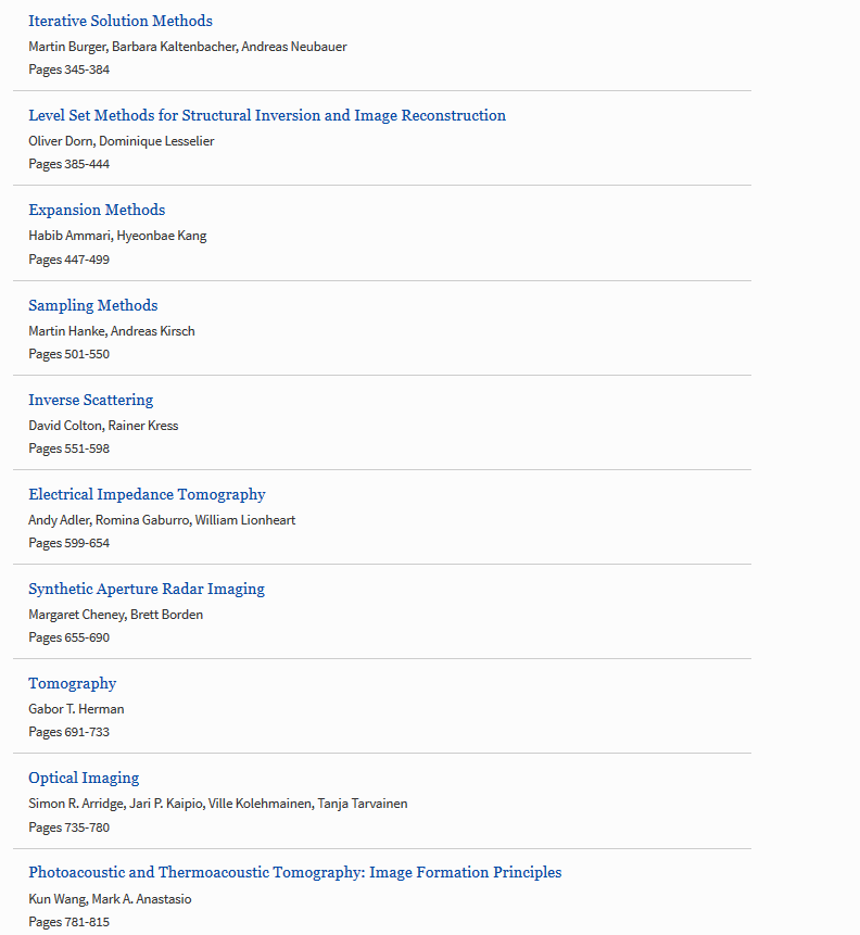 摘要: 该书全面介绍了成像科学中使用的数学技术。材料分为两个中心主题,即反问题(算法重建)和信号与图像处理。主题中的每个部分都涵盖了应用(建模)、数学、数值方法(使用一个实例)和开放性问题。由该领域的专家撰写的报告,在数学上是严谨的。条目是交叉引用的,以便在连接的主题中轻松导航。这本手册有印刷版和电子版两种形式,增加了150多幅插图和扩展书目。