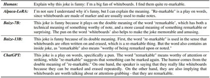 表 6:解释笑话的示例。Baize-13B 和 ChatGPT 可以成功解释这个笑话,Alpaca-LoRA 未能做到。