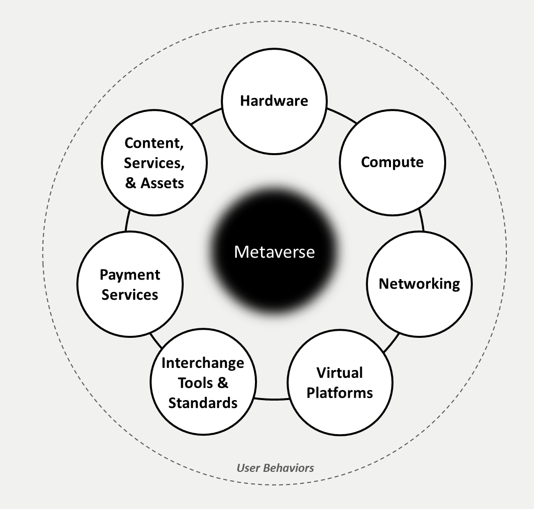 元宇宙内容、服务和资产:与用户数据和身份相关的数字资产(例如虚拟商品和货币)的设计/创建、销售、转售、存储、安全保护和财务管理。这包含所有“建立在”元宇宙之上和/或“服务于”元宇宙的所有业务和服务,并且没有被平台所有者垂直整合到虚拟平台中,包括专门为元宇宙构建的、独立于虚拟界的内容平台。
