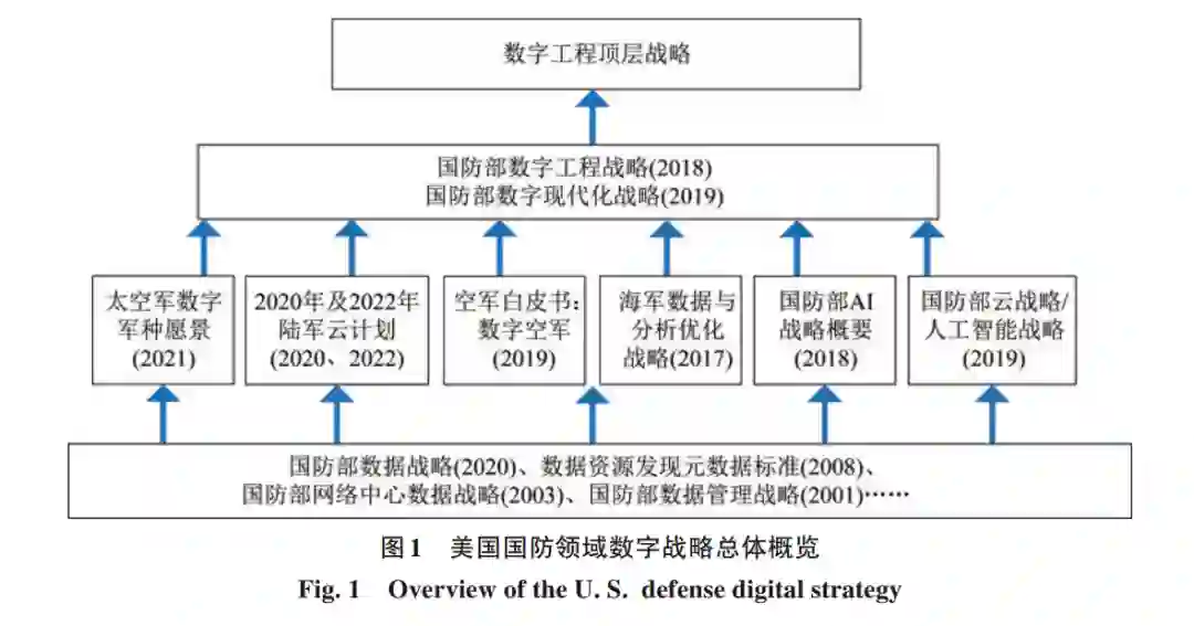 数字化转型是军备转型的战略需求,也是军事理念变革的重要保证,更是智能化技术条件下打赢未来战争不可或缺的一个重要环节。为持续保持战争优势,美军在第四次工业革命浪潮的冲击下积极推进数字化转型。本文分析了美军数字化转型的必要性、发展目标、意义和实施途径,并从标准规范建立、数据模型构建、人员数字化素养等方面提出了推进我国军队数字化 转型的具体措施。 随着量子计算、生物技术、人工智能、机器人技术 和纳米技术等多领域的技术突破,第四次工业革命利 用数字化重塑工业和社会模式,以前所未有的方式推 动军事领域变革。虽然战争的本质并未改变,但是军 事组成要素以及协作关系发生了颠覆性改变。首先, 数字技术、信息技术、物理技术等有机融合,战场指控 链、杀伤链、供应链、保障链等智能化水平大幅提升; 其次,各学科、领域不断交叉扩维,致使战略规划、作 战设计、武器装备研制趋于一体化;最后,深度学习技 术、大数据分析技术、机器技术、无人自主系统技术等 正在推动战争形态趋向无人化、自主化、智能化[1] 。为 适应第四次工业革命时代的变化,美军积极推动数字 化转型工程,这对提升美军战斗力和保障国家安全具 有重要意义。 美军数字化转型最早由美国国防部于 2003 年提 出,《美军转型计划指南》[2] 中强调将美军从一支适应 打机械化战争的军队,建设成为一支适应打网络中心 战的军队。2018年6月,美国国防部正式对外发布《国 防部数字工程战略》[3] ,将数字工程定义为一种集成的 数字方法,明确了数字工程的发展目标,即数字工程 战略旨在推进数字工程转型,将国防部以往线性、以 文档为中心的采办流程转变为动态、以数字模型为中心的数字工程生态系统,完成以模型和数据为核心的 范式转移。2019年7月12日美国国防部又发布了《国 防部数字现代化战略》[4] ,进一步为美军未来数字化转 型指明了发展方向。同年 7 月 19 日,美国空军发布 《数字空军白皮书》[5-7] ,提出以数字工程等敏捷方式变 革采购流程,打造“数字空军”。2020年6月,空军装备 司令部启动为期两年的“数字战役”,开始系统地推进 数字工程转型。2021 年 6月,美国空军设立数字转型 办公室,加速数字化转型进程。美海军陆战队于2020 年形成了《美海军和海军陆战队数字工程战略》[8] ,以 美国国防部的 5 个重点建设领域为蓝本提出建设方 案。美国陆军于2010年初步建成数字化陆战场,2021 年10月,美国陆军首席信息官办公室又先后发布了两 份数字化转型相关文件《陆军数字化转型战略》[9] 和 《陆军统一网络计划:启用多域操作》[10] ,旨在指导美 国陆军的数字化转型工作,使之更好地适应数字化战 争和多域作战[11] ,并计划于2028年具备单一战区多域 作战能力,2050 年建成陆海空天一体化数字化战 场[12-13]。美国国防领域数字战略总体概览如图 1 所示。