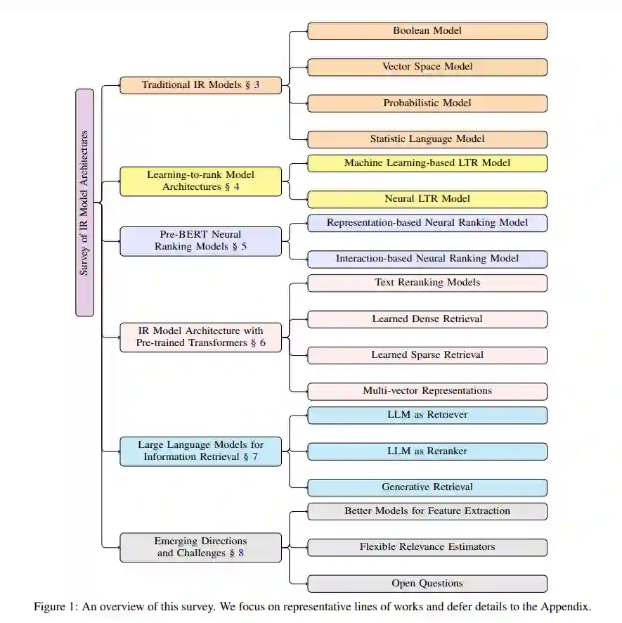 信息检索(IR)的目标是检索相关的信息源,以满足用户的信息需求。在过去几十年中,信息检索已经成为高效、有效地访问大量信息的重要工具,广泛应用于各类场景。除了其传统作用,信息检索如今还在协助大规模语言模型(LLM)生成有依据和事实性的响应方面发挥着至关重要的作用。信息检索的研究主要集中在两个关键方面:(1)提取更好的查询和文档特征表示;(2)开发更精确的相关性估计方法。查询和文档特征提取方法经历了从传统的基于术语的方法(如布尔逻辑和向量空间模型)到基于预训练语言模型的稠密检索等现代解决方案的演变(Lin et al., 2022)。相关性估计方法则随着特征表示的进展而发展。早期方法,包括概率性和统计性语言模型,使用基于术语特征的简单相似度函数计算相关性。之后,学习排序(LTR)技术应运而生,结合了机器学习模型和多层神经网络用于相关性估计(Li, 2011)。LTR方法的成功在很大程度上归功于其广泛使用手工设计的特征,这些特征源自文本术语的统计属性以及从网页浏览流量中收集的用户行为数据(Qin and Liu, 2013)。在2010年代,大量文献探讨了不同架构中的神经网络重排序模型,以捕捉查询与文档之间的语义相似度。随后,预训练的变换器模型,代表作BERT(Devlin et al., 2019),迅速革新了模型设计,进入了一个检索与排序模型采用更简化架构进行相关性估计的时代,例如基于学习到的神经表示的点积操作和多层感知机(MLP)层预测头(Karpukhin et al., 2020;Nogueira et al., 2020;Lin et al., 2022)。近年来,LLM的进展彻底改变了应用机器学习(ML)领域,包括信息检索。LLM的一个有趣特性是它们可以用于特征提取和相关性估计,并且在没有大量训练的情况下就能取得强大的性能(Ni et al., 2022a;Neelakantan et al., 2022;BehnamGhader et al., 2024;Sun et al., 2023;Qin et al., 2024a,等等)。LLM在信息检索中的崛起,建立在变换器(transformer)预训练语言模型的丰富基础上,这些模型已从早期的神经网络架构中发展而来,包括变换器(Vaswani et al., 2017)、递归神经网络(RNN,Elman, 1990)、注意力机制(Bahdanau, 2014)以及预训练的静态神经表示,如Word2Vec(Mikolov, 2013)和GloVe(Pennington et al., 2014)。本文回顾了信息检索中模型架构的演变(如图1所示)。在这里,模型架构的意义是双重的:它描述了(1)用于提取查询和文档特征表示的骨干模型;(2)处理原始输入、执行特征提取和估计相关性的端到端系统架构。与之前的研究和调查(Lin et al., 2022;Zhu et al., 2023)不同,我们有意将模型架构的讨论与训练方法和部署最佳实践分开,以提供一个更聚焦的架构分析。向神经架构的转变,特别是基于变换器的模型,已经从根本上改变了信息检索,使得更丰富、上下文化的表示成为可能,并改善了对复杂查询的处理。尽管这种演变提高了检索精度,但也带来了新的挑战,尤其是随着LLM的出现。这些挑战包括需要架构创新以优化性能和可扩展性,处理多模态和多语言数据,以及整合领域特定的知识。此外,随着信息检索系统越来越多地被集成到各类应用中——从机器人技术(Xie et al., 2024)、自主智能体(Wu et al., 2023)到蛋白质结构发现(Jumper et al., 2021)——该领域必须超越传统的搜索范式。我们在本文的最后将探讨这些挑战,并讨论它们对未来信息检索模型架构研究的影响。