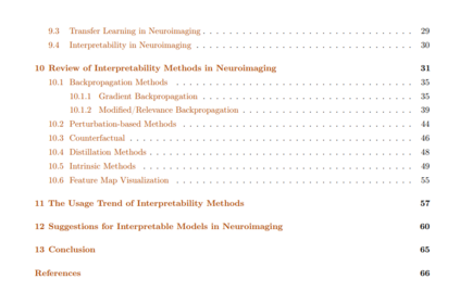 深度学习(DL)模型因其能够直接从原始数据中学习的端到端范式而受到欢迎,这消除了需要一个容易出错的单独特征提取阶段的担忧。最近基于DL的神经影像学研究相对于传统的机器学习算法也取得了显著的性能进步。但由于这些模型缺乏透明性,使得在真实世界应用中成功部署深度学习模型仍然存在挑战。近年来,可解释的AI(XAI)主要为了获得模型是如何做出决策的直觉而经历了一系列的发展,这对于医疗、金融和执法机构等关键安全领域至关重要。尽管可解释性领域显著地在进步,研究人员仍然不清楚后处理方法揭示了模型学习的哪一方面,以及如何验证其可靠性。本文全面回顾了神经影像学领域的可解释深度学习模型。首先,我们总结了一般性的可解释性资源的当前状态,重点关注方法的进展、相关的挑战和意见。其次,我们讨论了如何在多个最近的神经影像学研究中利用模型的可解释性来捕捉与模型预测最相关的解剖学和功能性大脑变化。最后,我们讨论了当前实践的局限性,并提供了一些有价值的见解和指导,以指导我们如何确定未来的研究方向,使深度学习模型得到实质性的解释,从而促进对脑部疾病的科学理解。 增进我们对大脑动态的理解是揭示潜在神经病理条件的基础 [1–3]。因此,定位和解释特定受试者的空间和时间活动可能有助于指导我们对障碍的理解。因此,神经影像学领域人工智能(AI)的一个持续目标是利用磁共振成像(MRI)数据使机器学习与潜在神经障碍相关的功能动态或解剖学变化。对大脑功能和结构的当前理解表明,不同大脑网络中的变化可以最好地解释大脑障碍 [4, 5]。此外,一个大脑网络不一定是空间定位的。传统的分析方法试图找到群体级别的差异,而不是处理个体级别的决策制定。然而,为了在临床实践中充分体现神经影像学研究的转化影响,医生必须将每个个体视为一个独立的病例。这些局限性自然地鼓励人们寻求AI引导的对精神障碍的理解 [6–8]。机器学习(ML)模型不是独立地查看大脑区域,而是使用先进的应用统计和数学优化技术从数据中寻找尚未被发现的整体模式 [9]。
