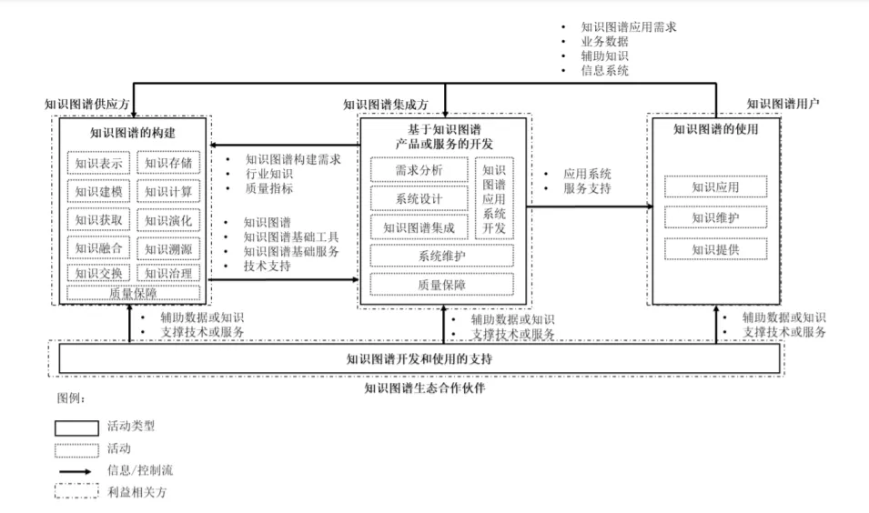 图2示出的四大类知识图谱相关活动简述如下: a) 知识图谱的构建:此组活动主要包括知识表示、知识建模、知识获取等活动。其主要目标是构 建出所需的知识图谱,同时开发出相应的基础工具和/或服务。此组活动的主要依据是知识图 谱应用需求和质量要求;往往需要行业知识、业务数据、辅助知识等予以支持。 b) 基于知识图谱的产品或服务开发:此组活动主要包括需求分析、系统设计、知识图谱集成等活 动。这些活动的执行基于上述a)描述的活动构建的知识图谱和相应的知识图谱应用需求等完成 知识图谱应用系统的开发和集成,并提供配套的产品或服务。 c) 知识图谱的使用:此组活动主要包括知识应用、知识维护、知识提供等活动。这些活动的执行 基于上述b)描述的活动产生的知识图谱应用系统或服务。通过这些活动完成知识的使用和维护, 并对外提供必要的知识。 d) 知识图谱开发和使用的支持:此组活动主要包括基础设施提供、数据提供、安全保障、咨询评 估等。它们对上述a)、b)和c)描述的活动的执行提供必要支持,例如:提供辅助数据或知识、 支撑技术或服务等。