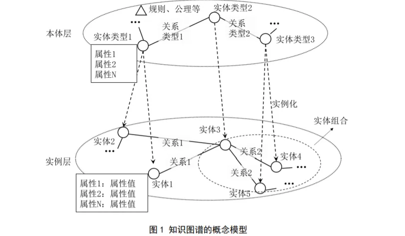 知识图谱的概念模型可划分为本体层和实例层,如图1所示。其中,本体层由实体类型和其属性、 实体类型间关系类型、规则等本体相关知识元素构成;实例层是对本体层的实例化,由实体类型对应 的实体及其属性以及实体间关系等实体相关知识元素构成。 图1示出的知识图谱概念模式的主体是实体。实体是真实对象的抽象,实体类型是某类实体的进一 步抽象。基于不同层次的抽象,图中的本体层和与实例层是相对的。构建某个知识领域的某个层次的 特定知识图谱时,“实体”这个抽象称呼将使用所关注的特定对象的具体名称取代。图中名为“属性” 的两个方框是分别针对本体层的所有实体类型和实例层的所有实体。本体层的“属性”是指对应实体 类型的属性,各个属性是概括性描述;实体层的“属性”是指对应实体的属性,是某实体类型实例的 属性的具体描述。同时,多个实体和关系的组合可以构成新的复杂实体,如:由时间、人物、地点等 要素构成的事件,由不同模块构成的产品等。