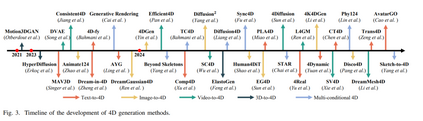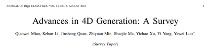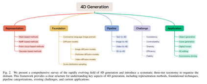 摘要——近年来,生成式人工智能在多个领域取得了显著进展。在2D和3D内容生成的成功基础上,4D生成技术将时间维度引入生成任务中,逐渐成为一个新兴且快速发展的研究领域。本文对这一新兴领域进行了全面综述,系统性地探讨了其理论基础、关键方法以及实际应用,旨在为读者提供对4D生成技术现状及未来潜力的整体理解。我们首先介绍了4D数据表示的核心概念,包括结构化和非结构化格式,及其对生成任务的影响。在此基础上,我们深入探讨了推动4D生成的关键技术,包括时空建模、神经表示和生成框架的最新进展。此外,我们回顾了近期研究中采用多种控制机制和表示策略生成4D输出的方法,对这些方法进行了分类,并总结了其研究轨迹。同时,我们探讨了4D生成技术的广泛应用,涵盖动态物体建模、场景生成、数字人合成、4D内容编辑以及自动驾驶等领域。最后,我们分析了4D生成技术面临的关键挑战,如数据可用性、计算效率和时空一致性,并提出了未来研究的潜在方向。我们的代码已公开于:https://github.com/MiaoQiaowei/Awesome-4D。 关键词——4D生成、动态3D生成、深度生成建模、扩散模型