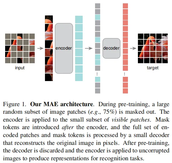 基于以上分析,研究者提出了一种简单、有效且可扩展的掩蔽自编码器(MAE)用于视觉表征学习。该 MAE 从输入图像中掩蔽了随机 patch 并重建像素空间中缺失的 patch。它具有非对称的编码器 - 解码器设计。其中,编码器仅对 patch 的可见子集(没有掩码 token)进行操作,解码器则是轻量级的,可以从潜在表征和掩码 token 中重建输入(图 1)。