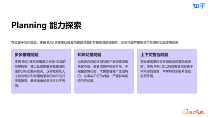 我们对复杂 query 的 planning 能力也进行了探索。传统 RAG 方案在处理复杂查询场景时存在局限性,如难以处理多步推理问题,存在知识幻觉,以及难以有效整合上下文信息等等。