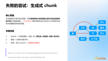 - 分块大小的选择直接影响效果,较大分块能保持完整语义,有助于理解全局内容;而较小分块处理更快,资源消耗更少。 这一方案面临的核心挑战是文档的多样性带来的问题。由于不同类型的文档和查询需求存在巨大差异,固定长度的分块策略难以同时满足语义完整性和处理效率的要求。该方案无法灵活适应不同场景,最终限制了系统的实际应用效果。进而,我们又探索了生成式 chunk,但未能成功落地。该方案的核心思路是不显式切分段落,而是直接使用大语言模型从原文中找出最相关的子串作为候选答案。也就是采用 End2End 的方式,解决灵活性和分块与问题相关性的问题。我们采用大语言模型+prompt 的方式合成 ranker,用约束解码的方式约束生成过程。
