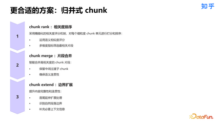 通过这一尝试,我们认识到性能优化是关键。推理延迟是核心挑战,为确保用户体验,我们必须最小化模型前向计算次数,每一次 forward 都需要严格控制计算开销。同时,我们还观察到大语言模型存在明显的最近信息偏好(recency bias),prompt 中的信息对模型评分的影响主要集中在序列的开始部分。在实践中发现评分模型具有局限性:✅评分模型在使用相同 prompt 时能够较好区分答案质量,高质量答案确实能获得更高分数❌但在前缀对比测试中表现不佳,同一个答案配上相关/无关前缀时的得分差异不明显。这反映了模型训练范式的局限,模型从未经过这种对比场景的训练。更合适的方案是归并式 chunk。包括三个步骤:相关度排序、片段合并和边界扩展。