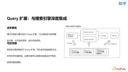 我们将 query 扩展与搜索引擎进行了深度结合,从而降低了成本,并且增强了可控性。因为 query 扩展放到了搜索引擎内执行,所以可以避免多次调用搜索引擎,这样既减少了资源消耗,又可以更好地控制相关性、多样性等关键指标,以提高检索准确率。我们定向训练了一个模型来完成 query 扩展任务。