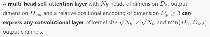 On the Relationship between Self-Attention and Convolutional Layers [link] Cordonnier, J., Loukas, A. and Jaggi, M., 2020. International Conference on Learning Representations.