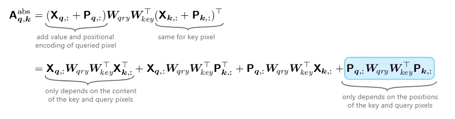 注意概率(图3,右上角)是根据输入值和层输入的位置编码计算的。我们已经看到,对于每个查询像素,每个头部可以聚焦在图像的不同部分(位置或内容)。我们可以明确地分解这些不同的依赖关系如下: