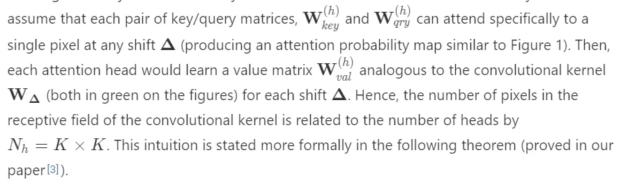 在我们关于卷积层和自注意力之间关系的论文[3]中,我们证明了一个自注意力层可以表达任何卷积滤波器,只要有足够的头和使用相对位置编码。这可能是为什么需要多个头的第一个解释。事实上,多头自注意力层概括了卷积层: 它学习整个图像上感受野的位置(而不是一个固定的网格)。感受野甚至可以根据输入像素的值进行调整,我们将这个有趣的特性留到以后的工作中。希望我们关于图像位置编码的发现也能对文本有帮助,似乎使用2维的相对位置编码就足够了,但我们需要在实践中验证这一点。
