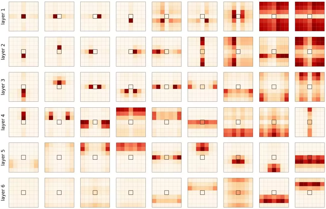 我们还可以观察到,第一层(1-3)专注于非常接近和特定的像素,而较深层(4-6)专注于图像整个区域的像素的更多全局斑块。在这篇论文中,我们进一步用更多的头做实验,观察到比网格像素更复杂的(学习到的)模式。