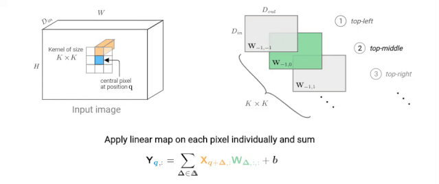 下图描述了如何计算像素q的输出值。在动画中,我们独立考虑每个核跳跃shift,这种观点可能不太常用,但在下面我们比较卷积和自注意力层时,它将被证明是有用的。