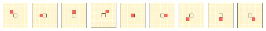 图1: 9个头的一个查询像素(黑色中心正方形)的注意力得分(单独标绘)。如果在每个查询像素上,每个注意力头都能在任意的移动中注意到单个像素(红色)会怎么样?然后,自注意层可以表示一个大小为3×3的卷积滤波器……我们证明了多头自注意层有能力表现这种模式,并且这种行为是在实际中学习得的。多头自注意是卷积层次的泛化。