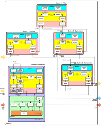 根据这一表述,从运行(外部)环境中收集数据的传感器和提供有关内部目标值实现情况数据的传感器都可以被考虑在内。Nechansky 提供了一个综合模型,其中包括 Beer 的系统 1 至 5 和 Miller 的生命系统。因此,内昌斯基[26]认为,米勒的物质能量处理子系统与比尔的系统 1(操作)相对应(见图 4)。不过,在讨论他提出的方法的有效性和局限性时,Nechansky 提出了一些可能会影响传感器 C2 的有趣意见[24,第 106 页]: "结构方面的考虑可能会明显松动,因为 Beer 的分级问题和相关的分级决策并不一定需要 [图 4] 所示的分级结构,也不一定需要为匹配 Beer(1979 年)的方案而开发的分级结构。任何具有足够数据处理能力的复杂系统都可以按顺序处理所有这些问题的逻辑层次,只需使用两个层次即可。然后,上层必须控制当前处理的是系统 1-5 中的哪些问题,并确保下层的决策使用正确的数据和目标值。这就是计算机处理这些问题的原理。这将把比尔的系统 1-5 问题的处理转化为两个结构层次,而不是如[图 4]所示的四个层次"。