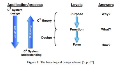由子系统组成的 C2 系统与 Brehmer 关于设计逻辑的讨论有关[7,第 212 页]。由此,Brehmer 认为,C2 系统的设计基本上是一个自上而下的过程,首先要确定设计该系统的目的。下一步是描述系统应实现的目标,即系统实现目标所需的不同功能。最后,布雷默提出,设计的最后一步是通过考虑如何实现系统的功能来描述系统的形式。布雷默还强调,该方案可自下而上地用于理解现有系统的运行方式[5](图 2)。