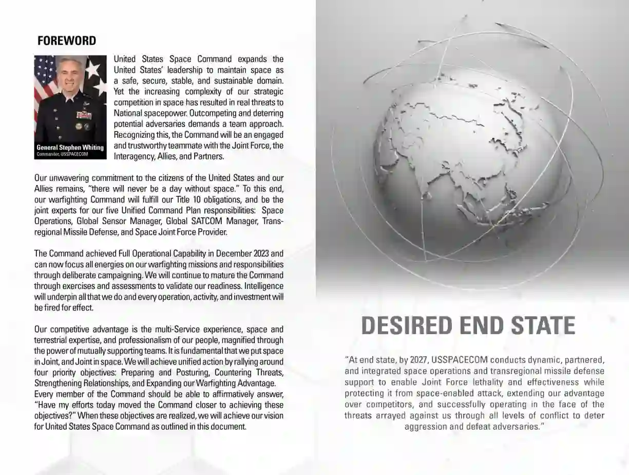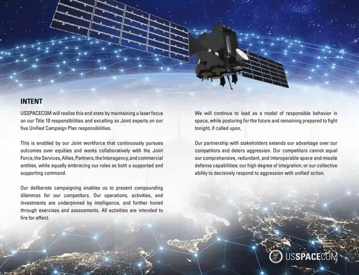 为了实现这一最终目标,文件强调司令部要 "集中精力 "履行其第 10 章职责和统一指挥计划职责:太空作战、全球传感器管理、全球卫星通信管理、跨区域导弹防御和太空联合部队提供者。此外,文件还概述了四个优先目标,这些目标一旦实现,将确保愿景得以实现:
