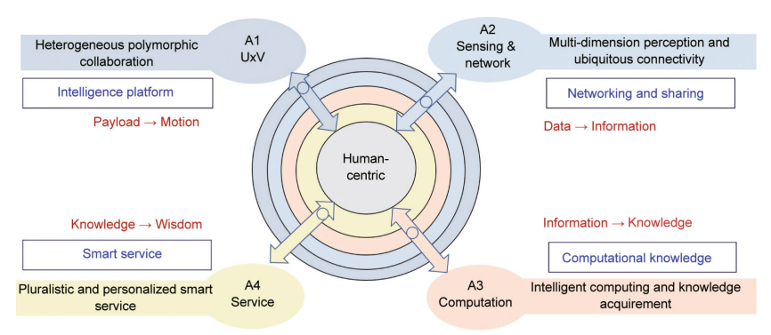图4. UnIC的以人为本的分层结构。A1:无人系统平台(UxV)层;A2:传感和网络层;A3:计算层;A4:服务层