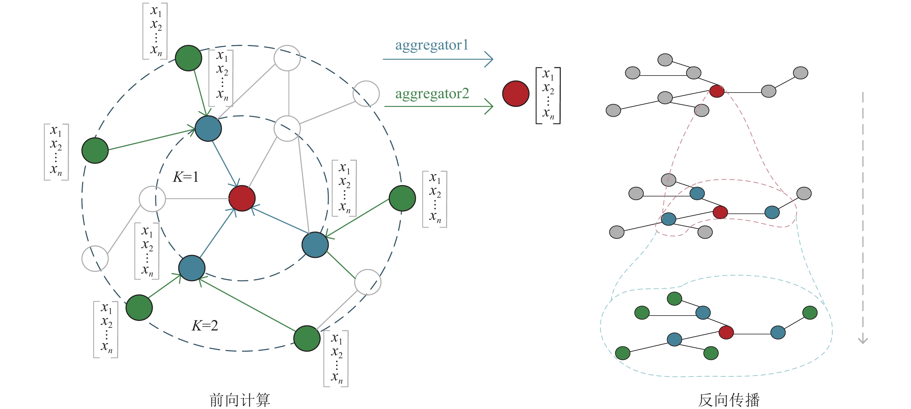 (1) 现有深度学习系统不能很好地抽象图传播过程. 现有的深度学习系统处理的是规则数据, 规则数据中每个样本的计算图是独立的, 与其他样本无关, 而图神经网络是将深度神经网络和迭代图传播结合起来进行计算的, 图数据的每个样本(即图顶点)之间具有依赖性, 所以现有系统不能自然地表达和有效地支持图传播模型. 如何突破现有框架的局限, 设计一种适用于图神经网络的系统架构是发展图神经网络的重要问题;