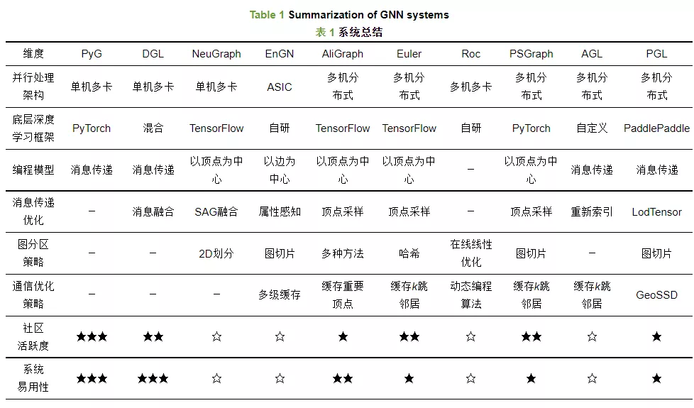 本节从系统架构、处理模型、图分区策略、通信优化策略、以及社区活跃度与系统易用性方面, 对现有图神经网络系统进行分析和对比, 并从多个维度对系统的特点进行总结, 以表格的形式清晰的展示系统的共性与不同, 来为研究人员提供有效参考.