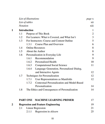 本书首先修正了“传统的”机器学习模型,并特别关注如何使它们适应涉及用户数据的设置。稍后,我们将开发基于更高级原则的技术,如矩阵分解、深度学习和生成建模。最后,我们对部署个性化预测系统的后果和风险进行了详细的研究。