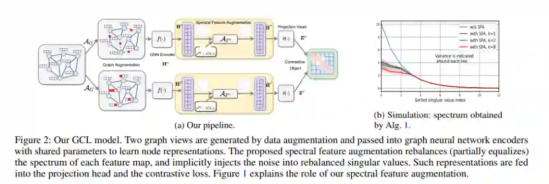 尽管增强(例如图边缘的扰动、图像裁剪)提高了对比学习(CL)的效率,但特征级增强是另一种看似合理的、互补的但未得到充分研究的策略。本文提出一种新的谱特征增强,用于图(和图像)上的对比学习。为此,对于每个数据视图,估计每个特征图的低秩近似,并从地图中减去该近似以获得其补集。这是通过本文提出的不完全幂迭代实现的,非标准幂迭代制度,具有两个有价值的副产物(仅在一或两次迭代下):(i)部分平衡特征图的频谱,(ii)将噪声注入到重新平衡的特征图奇异值中(谱增强)。对于两个视图,对齐这些重新平衡的特征图,这种改进的对齐步骤可以更多地关注两个视图矩阵的次要奇异值,而谱增强不影响谱角对齐(奇异向量没有被扰动)。推导了:(i)捕捉其频谱平衡效应的不完全幂迭代的解析形式,以及(ii)奇异值的方差被噪声隐式增强。谱增强还提高了泛化界。在图形/图像数据集上的实验表明,所提出的谱特征增强优于基线,并且与其他增强策略是互补的,并与各种对比损失兼容。
