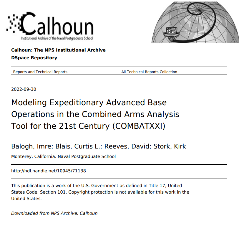 美国海军陆战队(USMC)正在进行组织和行动上的变革,以适应当今世界新的作战要求。美国海军陆战队部队设计2030描述了新的概念,如远征先进基地作战(EABO),需要对部队结构、任务和作战能力进行审查。为了检查和评估新的作战概念、部队结构、武器系统、战术、技术和程序,以及其他适应这种行动的措施,美国海军陆战队需要能够代表与这些预期变化有关的全部变化的模型和模拟。在过去的20年里,COMBATXXI拥有许多研究这些新概念所需的基本表现,但在一些关键领域缺乏现实的表现,例如在研究海上拦截的新作用的关键方面所需的海上水面战斗人员的表现。这种表述需要对这些平台进行识别、瞄准和评估损害,以确定其继续执行作战任务的能力。需要开展工作,审查与EABO有关的新概念,并利用COMBATXXI模拟确定相关的建模方法。