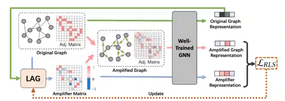 为了处理具有不同大小和无序节点的图,我们在这项工作中让放大器专注于为原始图的边生成权重。此外,基于拥有相似的拓扑结构和节点特征的图应有相似的ID模式的假设,LAG根据来自训练良好的GNN的原始图编码表示自适应地生成特定于图的放大器。这样,可以重复使用在训练良好的图编码器中的知识,LAG可以为具有不同拓扑结构的图定制放大器。注意,训练良好的GNN的输出节点表示不仅编码了节点特性,还编码了本地拓扑信息。因此,我们重新使用训练良好的GNN的节点表示,而不是原始特征,来发现ID图的潜在模式并生成放大器。形式上,我们利用下式计算放大器矩阵: 在这项工作中,我们使用多层感知机(MLP)生成放大器的元素。虽然可能有其他替代方案来产生放大器,但我们尽可能多地重用训练良好的GNN,并引入少量可学习的参数,以实现高效的图OOD检测。 正则化学习策略