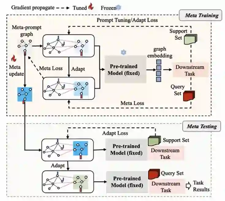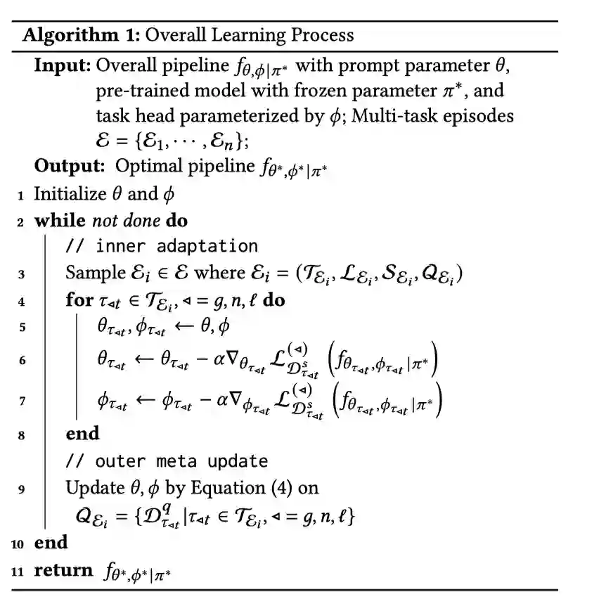 插入模式:设 是插入函数,表示如何将提示图 添加到输入图中,然后可以将操作后的图表示为 。我们可以定义插入模式为提示令牌和输入图节点之间的点积,然后使用定制的连接方式,例如 ,其中 是一个加权值,用于修剪不必要的连接: 作为另一种替代和特殊情况,我们还可以使用更简化的方式来获得 。 通过元学习进行多任务提示: 构建元提示任务:设是第个任务,具有支持数据 和查询数据 ;具体而言,对于图分类任务, 和 包含有标签的图;对于节点分类任务,我们生成了每个节点的诱导图,如第3.2.3节所述,将图标签与目标节点标签对齐,并将此图视为 或 中的成员;对于边分类任务,我们首先生成用于训练和测试的边诱导图,边的标签与其两个端点有关。 将元学习应用于图提示:设是提示参数,是预训练图骨干的固定参数,是任务参数。我们使用 表示具有提示图、预训练模型(,固定)和下游任务处理器的流水线。设是流水线在数据上的任务损失。然后对于每个任务,相应的参数可以更新如下: 其中初始化设置为:,。目标是学习元提示任务的有效初始化设置,可以通过在各种任务上最小化元损失来实现: 其中 是任务集。根据链式法则,使用二阶梯度来基于查询数据更新(或): 整体学习过程:为了提高学习的稳定性,我们将这些任务组织成多任务的episode,其中每个episode包含批量任务,包括节点分类(简称为“”)、边分类(简称为“”)和图分类(简称为“”)。设 是一个多任务episode。我们定义任务批次 ,其中每个子集 ;损失函数集 ,支持数据 ,其中每个子集 ,以及查询数据 ,其中 。然后,多任务提示的算法如下算法流程所示。将每个节点/边/图类别视为二进制分类任务,以便它们可以共享相同的任务头。