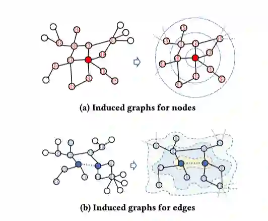 **重构下游任务:**具体而言,该工作通过分别为节点和边构建诱导图,将节点级和边级任务重构为图级任务。如下图a所示,目标节点的诱导图指的是网络中在距离𝜏内的其局部区域,也被称为其 𝜏-邻域网络。这个子图通过相邻节点的连接保留了节点的局部结构,通过相邻节点的特征保留了其语义上下文,这是大多数图神经编码器的主要关注范围。当该工作将目标节点的标签视为此诱导图的标签时,该工作可以轻松将节点分类问题转化为图分类问题;同样,该工作在下图b中为一对节点呈现了一个诱导图。在这里,如果有一条连接它们的边,则可以将这对节点视为正边,否则视为负边。通过将这对节点扩展到它们的 𝜏 距离邻居,可以轻松构建此子图。该工作可以通过将目标节点对的边标签分配为图标签来重新制定边级任务。对于无权图,𝜏 距离等于 𝜏 跳长度;对于带权图,𝜏距离是指最短路径距离,诱导图可以通过许多高效的算法轻松找到。