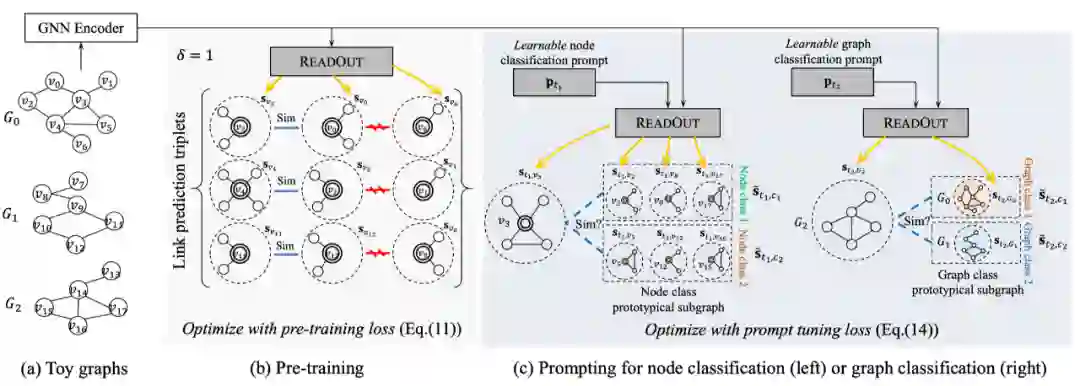 统一的任务模板:基于上述对节点和图级别实例的子图定义,该工作统一了不同的任务形式,以遵循一个共同的模板。具体来说,预训练中的链接预测任务和下游节点和图分类任务都可以重新定义为子图相似性学习。设是子图的向量表示,是余弦相似性函数。如图(b)和(c)所示,这三个任务可以映射到子图相似性的计算,其形式化如下。