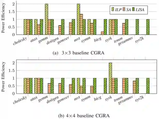 图3.LISA、ILP、SA性能对比****Power Efficiency(能效):图4展示了在3×3基准和4×4基准CGRA上能效的对比。