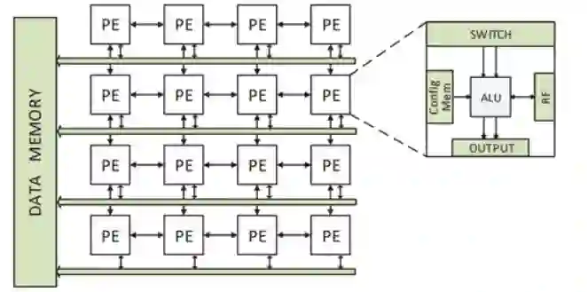 空间加速器是可编程的,包含诸如ALU(Arithmetic Logic Unit,算术逻辑单元)和MAC(Multiply Accumulate,乘法累加)的处理单元(Processing Elements,PE)、片上存储和片上网络。图1展示了一个4×4的CGRA,它是空间加速器的典型例子。