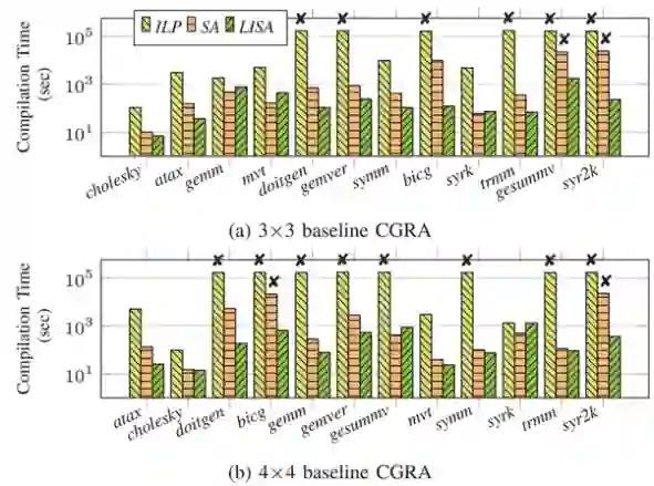 图4.基准CGRA上的能效对比****Compilation Time(编译时间):图5展示了三种方法在3×3基准和4×4基准CGRA上编译时间的对比。